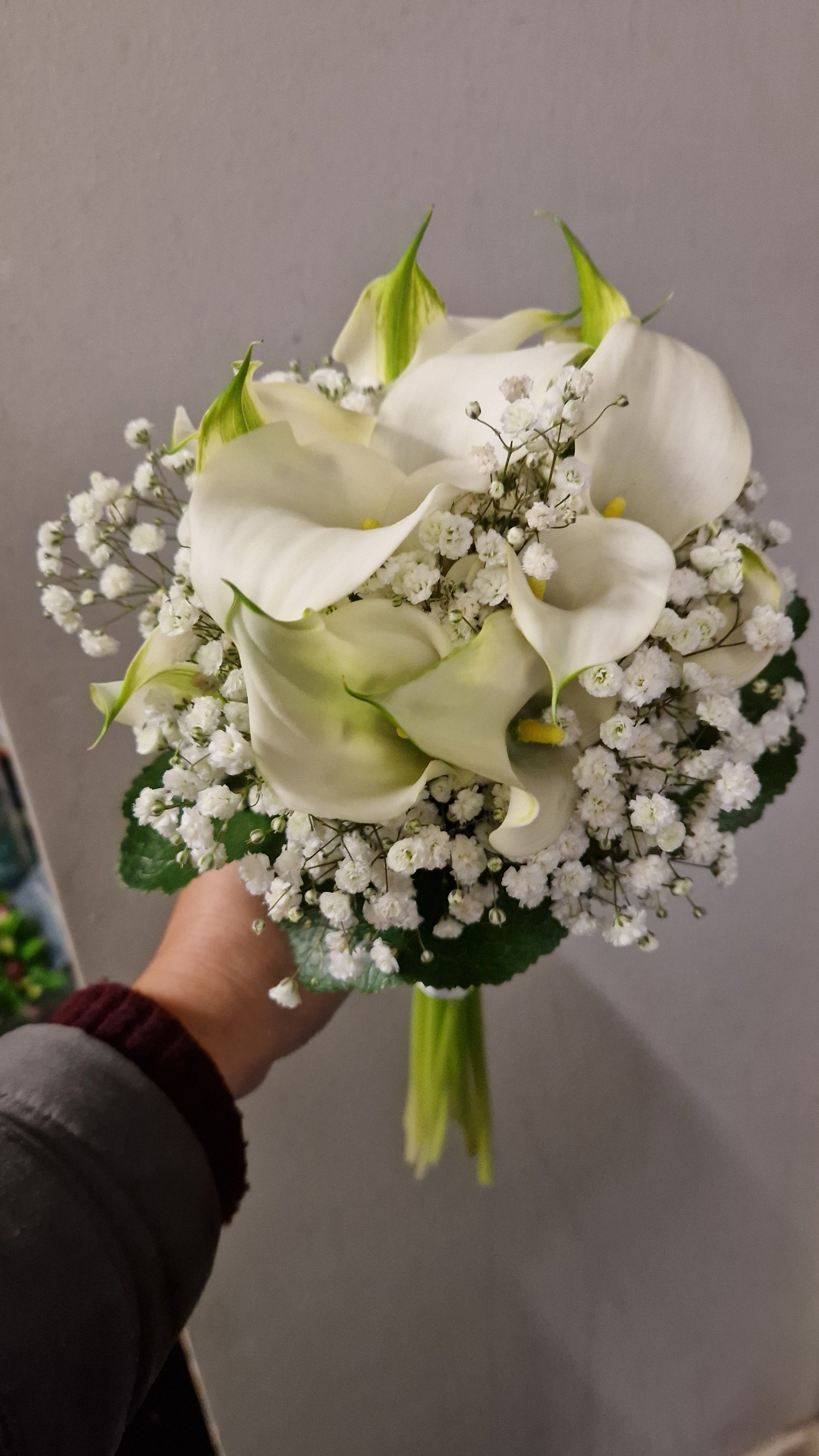 Complement your wedding attire with the refined elegance of this Calla Lily Bridal Bouquet. Made with white calla lilies, this bouquet will add a timeless and sophisticated touch to your special day. Enjoy the beauty of this classic floral arrangement and effortlessly enhance your bridal appearance.